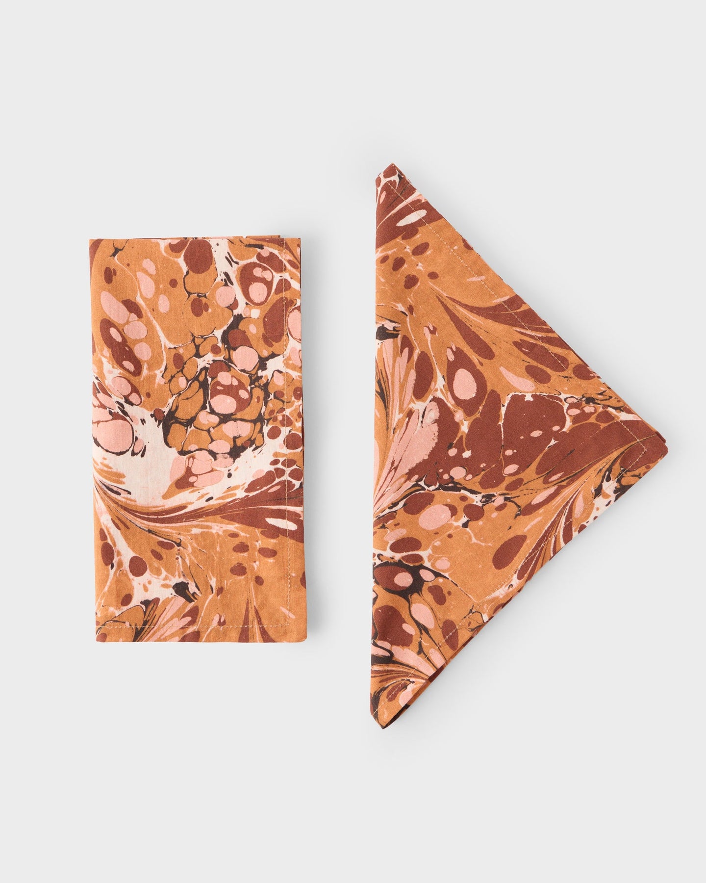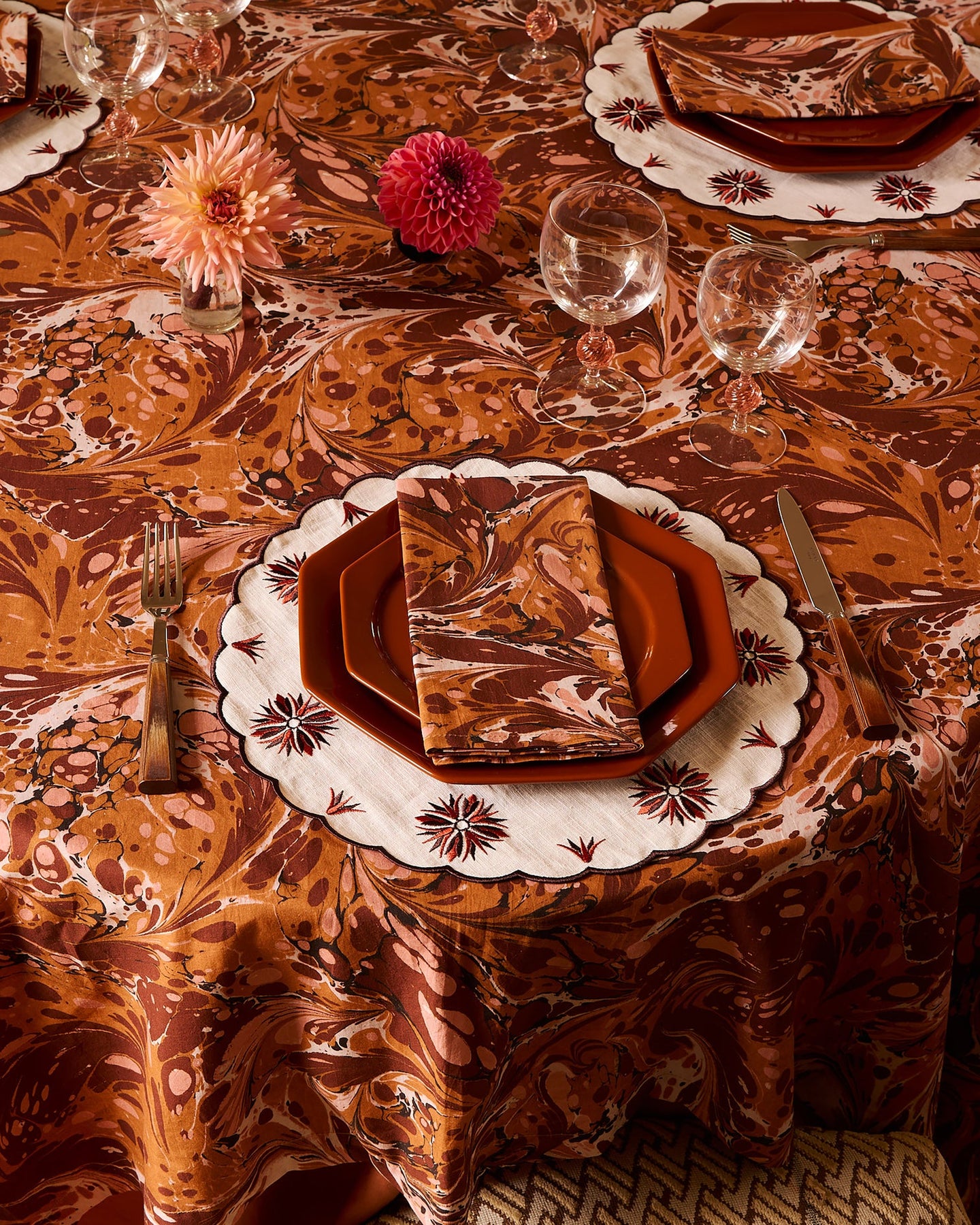 The Perusia Napkins come as a set of four, each showcasing an all-over marbled pattern in warm terracotta tones, inspired by traditional Florentine paper marbling. Printed in Italy on 100% linen, they are a vibrant homage to the centuries-old craft of hand-dyed paper developed in Florence.